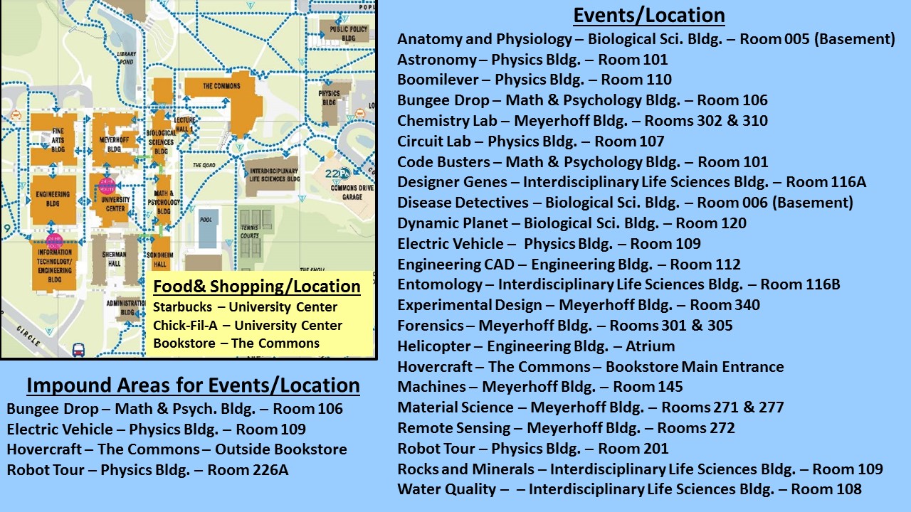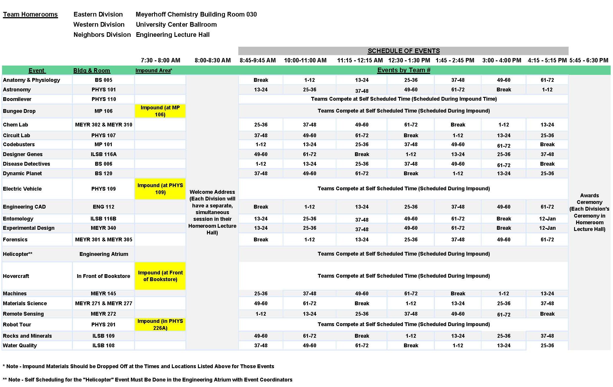 Below is a Schedule of Events throughout the day and their locations on campus. Upon arrival to campus, teams should deliver any impound items for the various events to the impound locations provided in the schedule below and then join their teams in the homerooms listed at the top of the schedule. A breakdown of team numbers and which division each team is in is provided below the schedule of events.